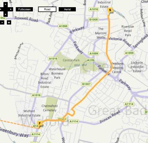It does a short loop around Harlow, starting on Second Avenue before heading to Velizy Avenue, then west along East Gate, then on to West Gate, then south along Haydens Road where it finishes just before the roundabout at Third Avenue.